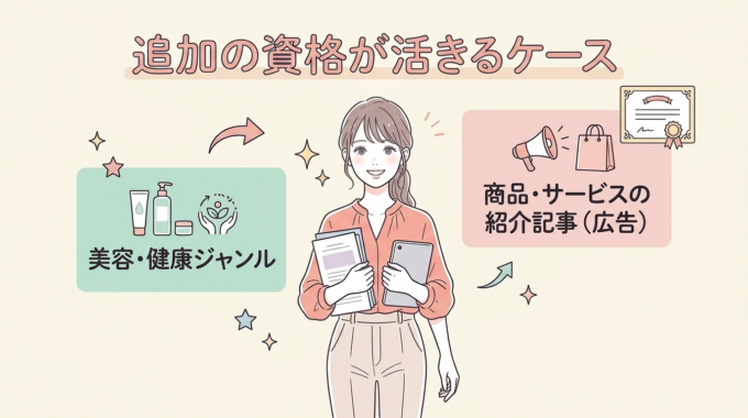 資格が必要かどうかの判断基準は、「情報提供の記事か、広告目的の記事か」だけ。サプリや化粧品・医療機器の広告記事を受けたいなら、薬機法や景表法の知識が必要になってきます。